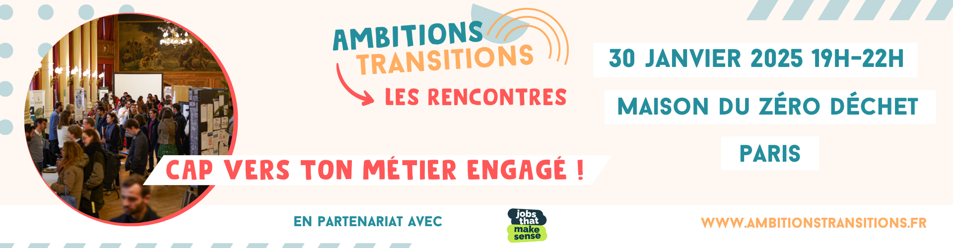 Après l’organisation avec succès de 3 forums, l'association Ambitions Transitions lance un nouveau format : les Rencontres Ambitions Transitions. Des soirées thématiques pour mettre en avant les métiers engagés et les formations aux métiers de la transition.